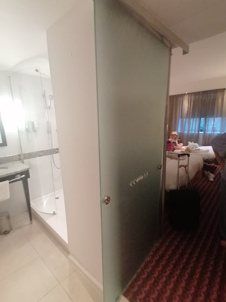 We got to the room which wasn’t quite as big as the app plan had suggested, and quickly we realised the glass shower / wardrobe sliding door was broken, off its sliding rail, and just leaning precariously against the wall. We needed a little privacy so this wasn’t going to work and we had to go back to the reception and arrange a room change. The receptionist was very kind and moved us to, another room, albeit minus the view.