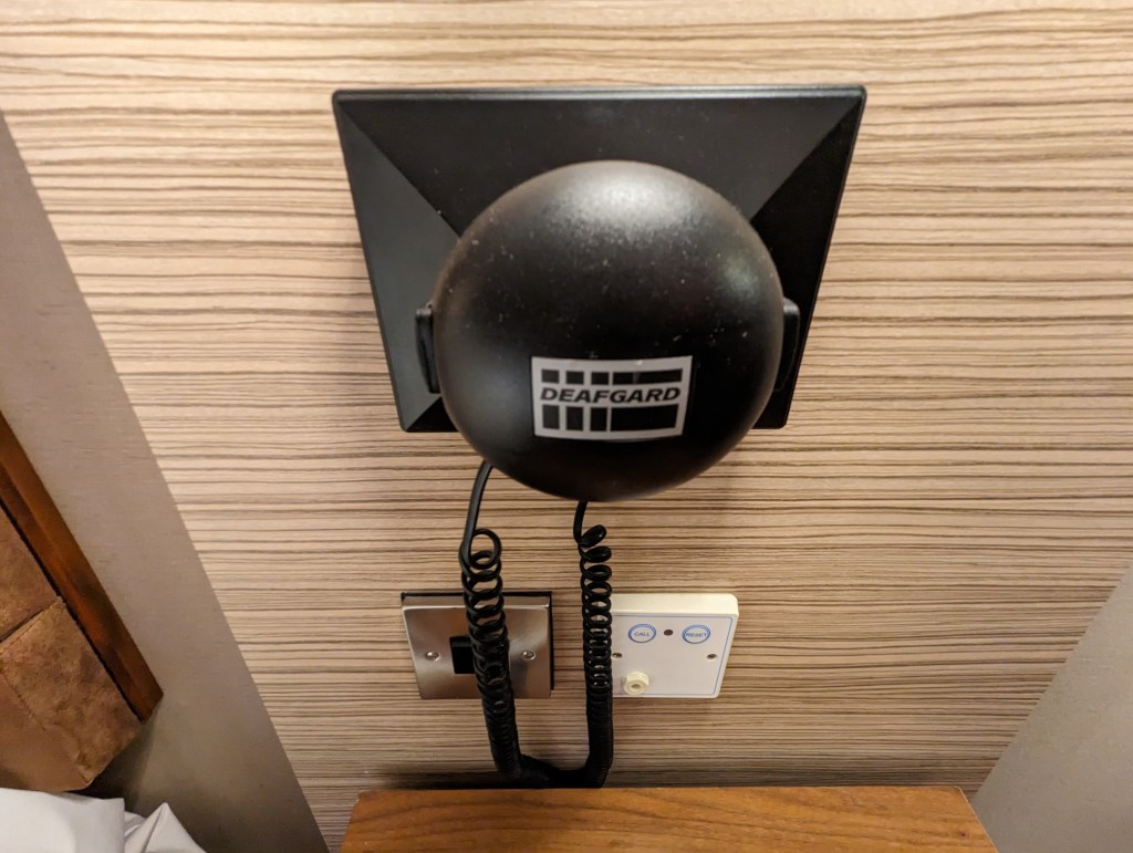 We had been given an accessible room as requested and this was for once a PROPER accessible room – high level toilet, roll in shower, rails everywhere without looking clinical. There were hearing links for the hard of hearing, wardrobes with pull down rails to suit a wheelchair user, and a host of other subtle but essential features.