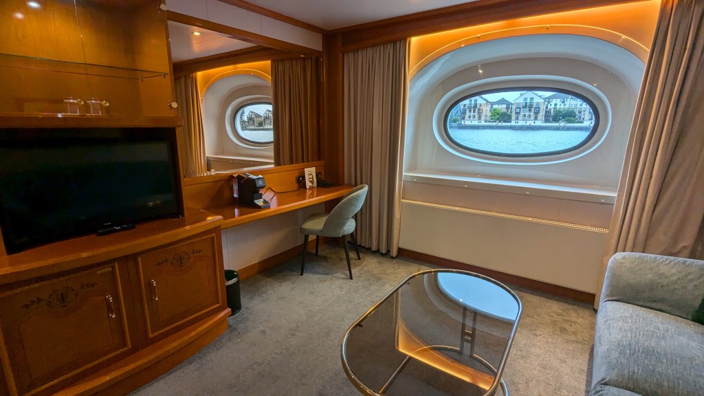 Will we stay again? Absolutely, we loved the ambience, the sizeable well fitted rooms – sorry, cabins – (and you’ll never find a cruise line with standard outside cabins as large and as plush as these), and the fairly easy access on the DLR to the city centre.